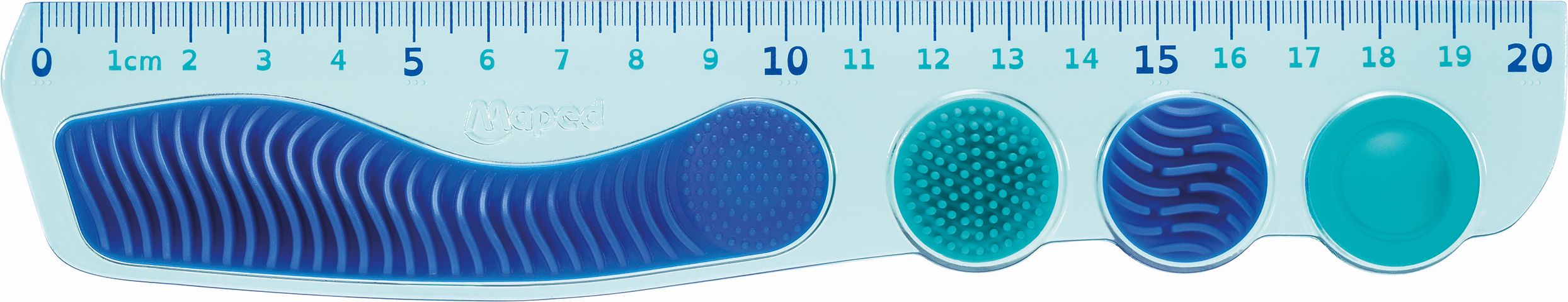 A kollekció tagjai között szerepel a 20 cm hosszú törésálló, műanyag vonalzó, amely többféle tapintható felülettel segíti a gyerekeket a koncentrálásban.
