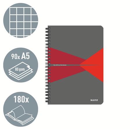 Spirálfüzet, A5, kockás, 90 lap, PP borító, LEITZ "Office", szürke-piros