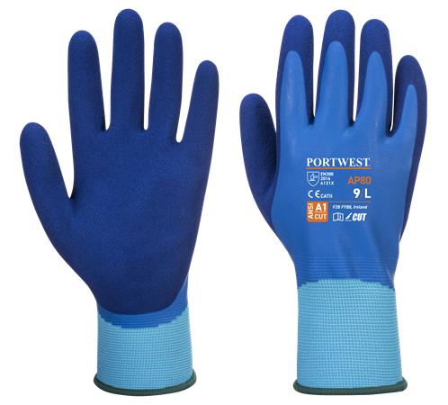 Védőkesztyű, latex, latexhab, tenyerén mártott, L méret "Liquid Pro", kék